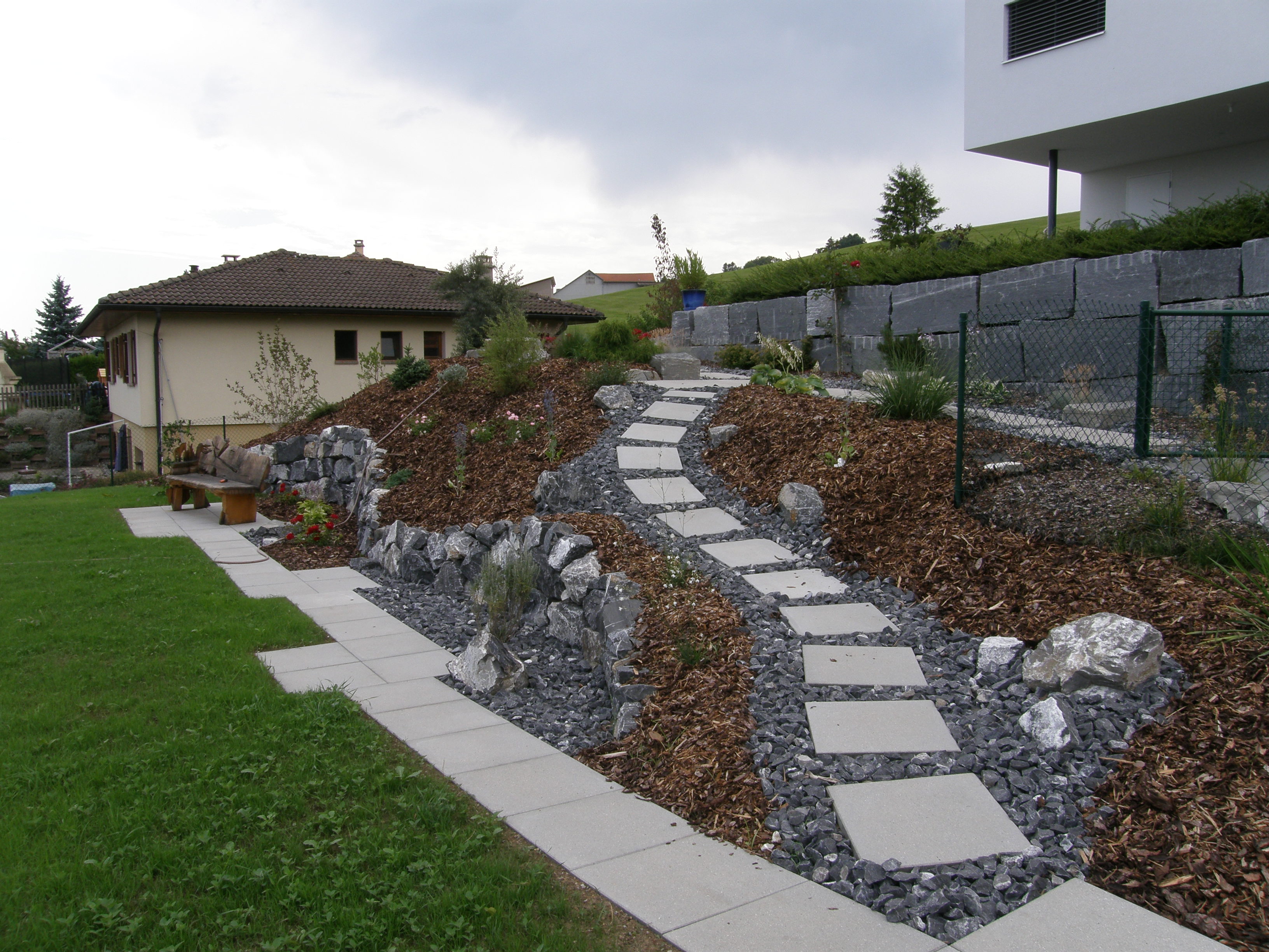 - Pavages, dallages, escaliers et muret en béton, pierres naturelles et grès-cérame